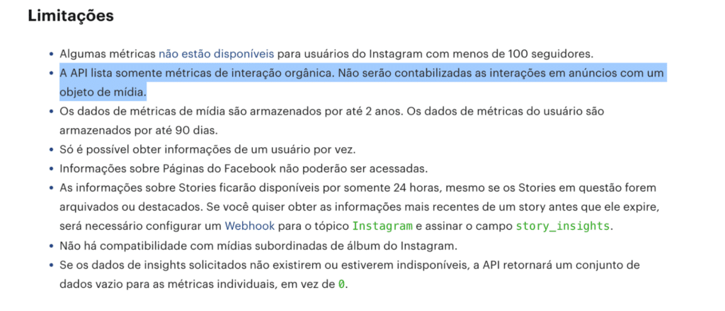 Informe aos responsáveis pela análise que os dados retornados pela API do Instagram refletem exclusivamente interações orgânicas, garantindo que as expectativas em relação aos relatórios estejam alinhadas com as limitações técnicas da plataforma.Mais informações estão disponíveis na documentação oficial da API do Instagram.