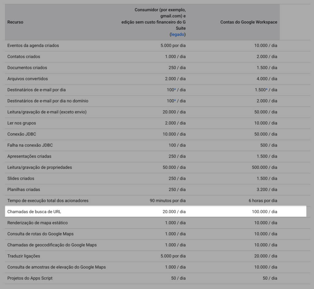 Fonte: Quotas do Apps Script