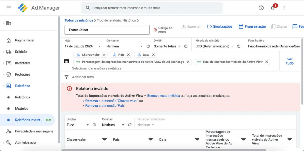 Nem todas as combinações de dimensões e métricas são compatíveis. Por exemplo, ao criar um relatório que inclua a métrica “impressões ativas”, será necessário optar entre as dimensões “país” ou “chave-valor”, mas não ambas simultaneamente. Essa é uma limitação imposta pelo Google, tanto na interface dos relatórios interativos no Ad Manager quanto na API.